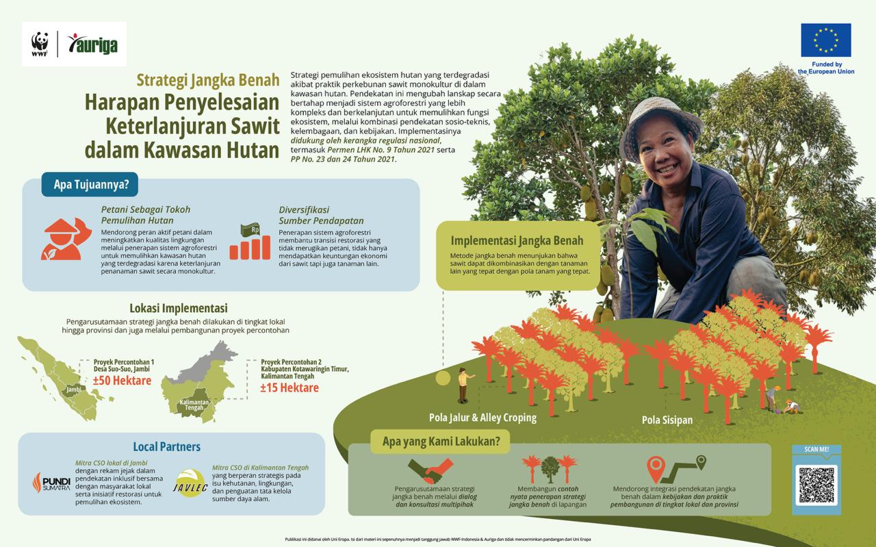 Strategi Jangka Benah (SJB) merupakan pendekatan inovatif untuk memulihkan ekosistem hutan yang terdegradasi akibat praktik perkebunan sawit monokultur, dengan mentransisikannya menuju sistem agroforestri yang lebih berkelanjutan. Infografis ini menjelaskan bagaimana SJB menempatkan petani sebagai aktor utama dalam upaya pemulihan lingkungan sekaligus memperkuat ketahanan ekonomi mereka. Melalui pendekatan ini, diharapkan tercipta keseimbangan antara pemulihan ekologi dan peningkatan kesejahteraan petani.